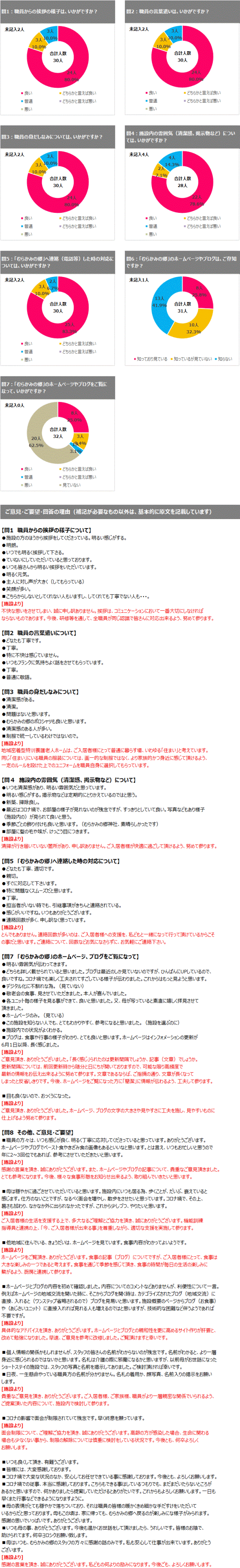 「むらかみの郷」では、ご入居者様・ご利用者様のご家族に、当施設・事業所より提供されるサービスの質を向上させる目的から、アンケートのご協力をお願いしています。ご協力頂きました皆様、この場をお借りして御礼申し上げます。誠にありがとうございました。