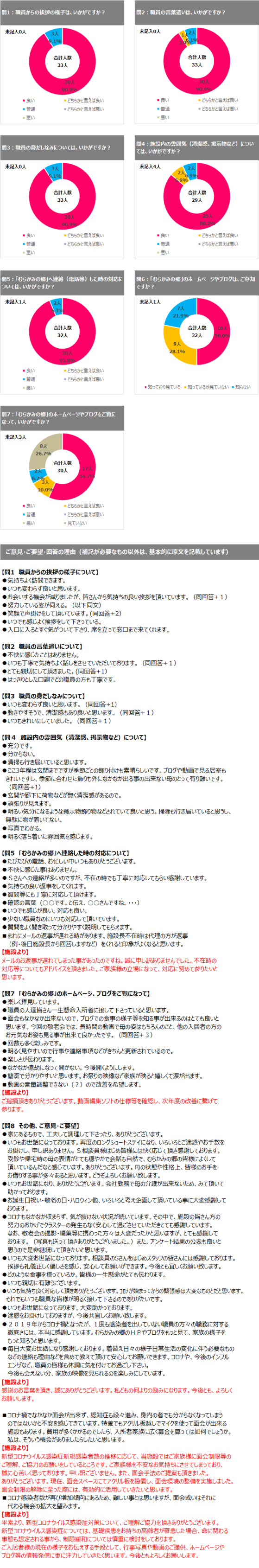 「むらかみの郷」では、ご入居者様・ご利用者様のご家族に、当施設・事業所より提供されるサービスの質を向上させる目的から、アンケートのご協力をお願いしています。ご協力頂きました皆様、この場をお借りして御礼申し上げます。誠にありがとうございました。